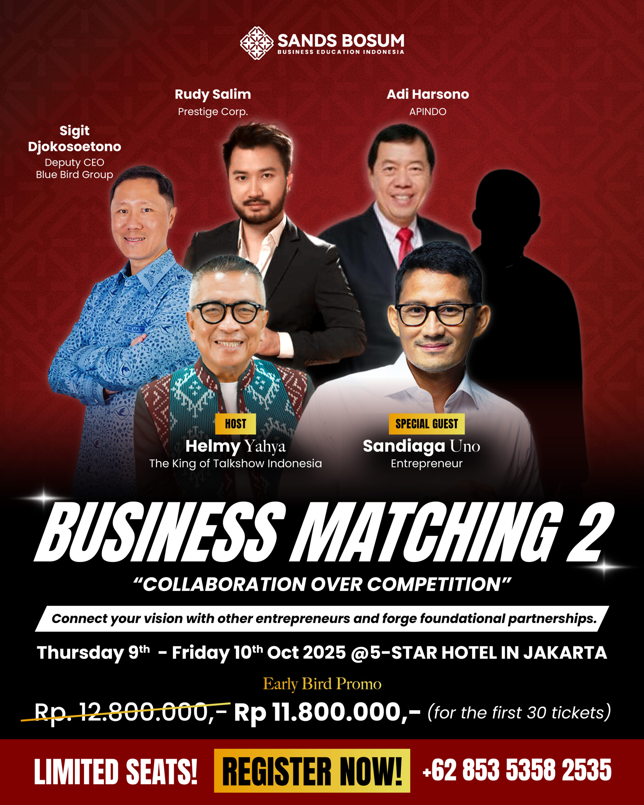 Business Matching adalah acara eksklusif satu hari yang dirancang khusus untuk mempertemukan para pemilik bisnis, CEO, dan pemimpin senior dalam sebuah forum networking yang berdampak tinggi, sesi berbagi pengalaman, serta peluang kolaborasi. Melalui sesi inspiratif yang dipandu oleh Helmy Yahya dan para CEO dari perusahaan-perusahaan ternama, serta dilengkapi dengan gala dinner, para peserta akan membangun kemitraan dan menjajaki peluang kerja sama.